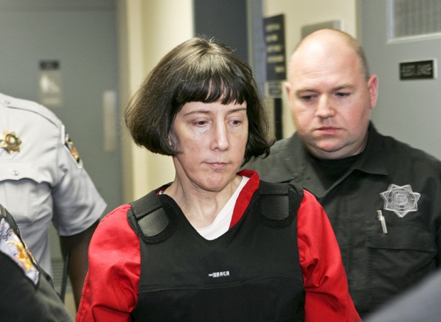 bióloga Amy Bishop é escoltada por policiais durante audiência em