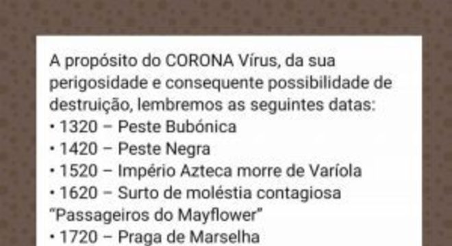 Texto publicado em diversas páginas no Facebook na segunda semana de fevereiro de 2020: “A propósito do Coronavírus, da sua perigosidade e consequente possibilidade de destruição, lembremos as seguintes datas: • 1320 – Peste Bubónica • 1420 – Peste Negra • 1520 – Império Azteca morre de Varíola • 1620 – Surto de moléstia contagiosa ‘Passageiros do Mayflower’ • 1720 – Praga de Marselha • 1820 – Epidemia de Cólera • 1920 – Gripe Espanhola • 2020 – Coronavírus Dá que pensar, não dá? Será coincidência”